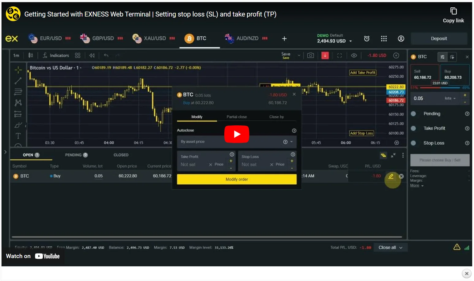 Getting Started with Exness Web Terminal | Setting stop loss (SL) and take profit (TP)Exness 網頁終端入門 | 設定停損 (SL) 與停利 (TP)